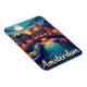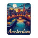 Experience the enchanting beauty of Amsterdam by night with our travel ad illustration. This captivating piece captures the city's iconic canals, illuminated by the warm glow of streetlights and reflections dancing on the water. Picture yourself strolling along historic bridges, enjoying the ambiance of cozy canal-side cafes, and feeling the magic of Amsterdam's nocturnal charm. Embark on a journey to the Netherlands, where every canal corner is a canvas of nighttime splendor.