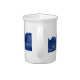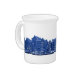 White porcelain pitcher with traditional canal houses and boats in blue Delftware style on a white background.