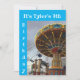 Image of a swing ride at an amusement park on the front. Party details on the back.