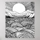 This abstract black-and-white poster captures the serene essence of a sunset beach through intricate zentangle patterns. The horizon is defined by a bold, minimalist line separating a hypnotic sun—radiating precise, spiraling geometric rays—from a tranquil ocean below. Waves curl into layered labyrinths of flowing lines, dots, and tessellations, while the sandy shore transitions into delicate patterns of shells, starfish, and abstract textures. The sun, partially submerged at the horizon, blends organic curves with structured mandala-like details, creating a meditative focal point.