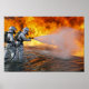 An aircraft rescue firefighting team attempts to spray out a fuel fire