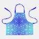 An apron with a blue and light blue polka dot design. The top image shows the apron alone, while the bottom image shows a smiling child wearing it.
