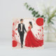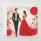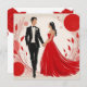This is a stylized, romantic illustration of a couple, likely representing a bride and groom or a formal event like a prom or gala. The man is dressed in a sharp black tuxedo with a white shirt and black bow tie, accented with a white boutonnière. He has dark hair and a chiseled profile. The woman wears a striking, strapless red ball gown with a flowing skirt. Her long, dark hair is styled with waves, and she wears a delicate, sparkling tiara.