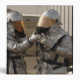 An Iraqi firefighter double checks his partner's personal protective equipment featured with equipment.