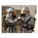 An Iraqi firefighter double checks his partner's personal protective equipment featured with equipment.