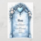An ornate light blue archway with floral accents, a heart emblem, and roses. Discover an elegant archway featuring two columns with a vaulted top, richly adorned with intricate carvings and a central heart-shaped emblem. White roses with peach hues, delicate leaves, and small white blossoms frame the strikingly designed portal. Ideal for company or product presentations, weddings, or event designs that combine classic romance with modern color schemes.