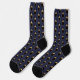 This awesome pair of patterned crew socks features a graphic image of a brown nestbox in a clock tower with two red eyed ravens flying towards it, one from the left and one from the right. The Ravens are black and have red eyes. There is also a third Raven hiding inside the black darkness of the nest with only the creepy red eyes showing in the dark. There is a clock above the entrance to the nest with a yellow face and darker roman numerals on it. Instead of 12 at the top there is a 13. The design gets its name from a group of Ravens which is known as an unkindness.
