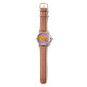 I only have one complaint. I ordered the watch with clear case and strap, and what was sent was white case and strap. I'm going to keep it because 1) it looks very nice in white, and 2) it would take too long to get a replacement made and sent in time for my occasion. Aside from the mix up with the color, the watch does look very good in white. The purple dial is actually sparkly which did not show in the online images. That was a nice surprise. If you like Swatch watches this is very similar to those. It's 33.6mm in diameter, 10.5mm thick, and 40.6mm lug to lug. Stainless steel case back says 3ATM/30m WR, so no swimming or showering or submerging this one. If you like Woodstock, this is a great choice.