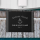 Nautical Boutique Co.'s nautical welcome mat cheerfully welcomes everyone aboard with boat name and home port. The background is black and the accent stripes and hand-drawn anchor are white. #Nautical #BoatName #NauticalGifts #WelcomeAboard #000000