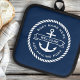 Pot holder featuring an anchor with a ribbon banner across it with customizable text "welcome". Add your boat name above and hailing port below. Around the anchor and text is a round rope border. White design on dark blue background