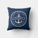 Throw pillow featuring an anchor with a ribbon banner across it with customizable text "welcome". Add your boat name above and hailing port below. Around the anchor and text is a round rope border. White design on dark blue background.