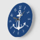 This nautical themed clock has an image of an anchor on a navy blue background.