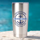 Insulated tumbler featuring a dark blue nautical anchor surrounded by a rope border. Across the anchor is a light blue banner with customizable text "welcome aboard". Add your boat's name and hailing port.