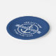 Paper plate featuring a white nautical anchor surrounded by a rope border on a dark blue background. Across the anchor is a light blue banner with customizable text "welcome aboard". Add your boat's name and hailing port.