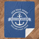 Sherpa blanket featuring a white nautical anchor surrounded by a rope border on a dark blue background. Across the anchor is a light blue banner with customizable text "welcome aboard". Add your boat's name and hailing port.