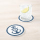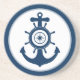 Custom sandstone coaster with nautical theme illustration featuring a blue anchor, steering wheel and compass logo on white.