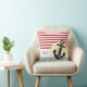 This pillow features a graphic of an anchor with a rope, a yellow and white striped sun and several lines of blue water waves all on a red and white striped background. Customizable text allows for personalization. This pillow is a perfect accent for any lake or beach home.