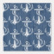 Vintage anchors in white are set against a background of old wood boards tinted cobalt blue to make a great nautical themed rustic wallpaper.
