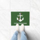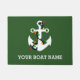 This doormat or welcome mat is ready to be personalized with the name of a boat or with any custom text. It features a simple hand drawn style illustration of a boat anchor in white with colorful Christmas lights wrapped around set against a green background making it perfect for adding a holiday touch to your boat or creating a personalized gift for boaters.