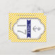 Yellow, white stripes and anchor nautical wedding table number postcard. A stylish striped pattern design with yellow, white diagonal stripes, a grey anchor with a blue heart and rope and your text in a frame with a navy blue banner. Contemporary yet with a vintage look in a sense. You can change background and text color choosing from over 200 colors from Zazzle color chart. This classy design is a completely customizable template and is part of a wedding set perfect for a summer wedding.