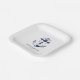 Nautical blue and white wedding paper plates. Great for a Navy (military) or lake house wedding. Design features an anchor wrapped in a banner with text "Anchored in love". Personalize it with your wedding details.