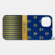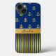 Stylish Samsung Note 4 case done, with graphics of gold tone anchors against a blue background, on the top half of the case. The bottom of the case has a gold and blue stripe pattern, with a gold tone band, across the middle. Personalize the dark blue text, on the golden band, for yourself or as a great gift idea.