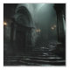 A monumental stone staircase rises through swirling mist inside a decayed Gothic cathedral, illuminated by soft daylight streaming through a broken oculus high above. Tall arches, cracked columns, and an imposing carved door stand in solemn silence, their surfaces aged by time and water, while faint sconce light adds warm flickers to the cold gray stone. The atmosphere is heavy with reverence, melancholy, forgotten sanctity, and the quiet pull toward transcendence—ideal for meditation rooms, moody bedrooms, home offices, therapy spaces, gothic-themed reading nooks, or as evocative gifts for lovers of ancient architecture, spiritual introspection, dark romanticism, fantasy ruins, or anyone drawn to haunting, atmospheric depth.