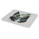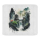 A beautiful square cutting board showing an ink illustration of a landscape with ancient Chinese architecture and majestic waterfalls.