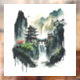 A beautiful window decal/window cling showing an ink illustration of a landscape with ancient Chinese architecture and majestic waterfalls.