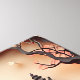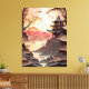 A beautiful brown stretched canvas print with a paper cutout scene depicting ancient Chinese building, trees, mountains and lake.