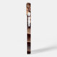 A beautiful brown iPhone 14 case with a paper cutout scene depicting ancient Chinese building, trees, mountains and lake.