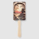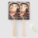 A beautiful brown set of hand fans with a paper cutout scene depicting ancient Chinese building, trees, mountains and lake.