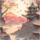 A beautiful brown xxx with a paper cutout scene depicting ancient Chinese building, trees, mountains and lake.