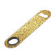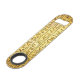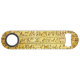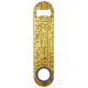 A yellow bottle opener with ancient hieroglyphs engraved on stone.