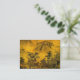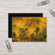 This fine art artist trading card features an impression of an ancient oriental landscape. Two small figures are walking through trees toward a pagoda in the foreground. Mountains loom in the distance. The autumn colors are gold, yellow, orange, green, brown and black.