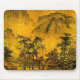 This fine art mousepad features an impression of an ancient oriental landscape. Two small figures are walking through trees toward a pagoda in the foreground. Mountains loom in the distance. The autumn colors are gold, yellow, orange, green, brown and black.