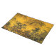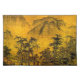 This fine art placemat features an impression of an ancient oriental landscape. Two small figures are walking through trees toward a pagoda in the foreground. Mountains loom in the distance. The autumn colors are gold, yellow, orange, green, brown and black.
