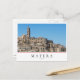 Photo postcard of the ancient architecture of the Sassi di Matera with houses cut into the mountain like caves on a clear day with a blue sky in the Basilicata region in southern Italy with the text 'Matera, Italy' in a white box and with stripes in green, white and red, the colors of the italian flag.