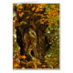This fine art photography blank note card displays an ancient brown and black maple tree trunk surrounded by brilliant autumn foliage in yellow, red, orange and green. The old knots and bark form an interesting abstract pattern.