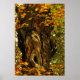 This fine art photography poster displays an ancient brown and black maple tree trunk surrounded by brilliant autumn foliage in yellow, red, orange and green. The old knots and bark form an interesting abstract pattern.