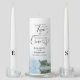 This stunning wedding unity candle set will make a wonderful addition to any wedding ceremony. It features an elegant and romantic design with a single pale dusty blue or powder blue colored rose reflecting in a pool of water. The quote reads "and the two shall become one" in fancy calligraphy word art. There is space for the names of the couple and wedding date with the couple's initials on each of the tapers. Wonderful way to express your love during your wedding ceremony, and a beautiful keepsake for years to come.