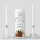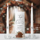 This stunning wedding unity candle set will make a wonderful addition to any wedding ceremony. It features an elegant boho chic floral design with a cluster of hand painted watercolor roses in autumn shades of rust orange, burnt umber, and coral peach. The quote reads "and the two shall become one" in fancy calligraphy word art. There is space for the names of the couple and wedding date with the couple's initials on each of the tapers. Wonderful way to express your love during your wedding ceremony, and a beautiful keepsake for years to come.