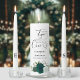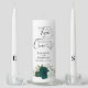 This stunning wedding unity candle set will make a wonderful addition to any wedding ceremony. It features an elegant boho chic floral design with a cluster of hand painted watercolor roses in shades of emerald, forest, and mint green. The quote reads "and the two shall become one" in fancy calligraphy word art. There is space for the names of the couple and wedding date with the couple's initials on each of the tapers. Wonderful way to express your love during your wedding ceremony, and a beautiful keepsake for years to come.