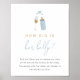 This how big is her belly baby shower game sign features a dusty blue and gold baby bottle and champagne glass and handwritten fonts. This design is perfect for your boy baby shower at any time of year.