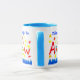 A large white ringer mug with a powder blue rim and handle and the words, 'This mug belongs to' in matching blue lettering, followed by 'Andrew' in handpainted paper collage, with a sprinkling of red, orange and yellow stars, on a white background. Microwave and dishwasher safe.