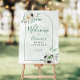 Celebrate the bride-to-be with this elegant bridal shower welcome sign featuring a floral arch with watercolor anemone and eucalyptus greenery bouquets on a sage green watercolor background.