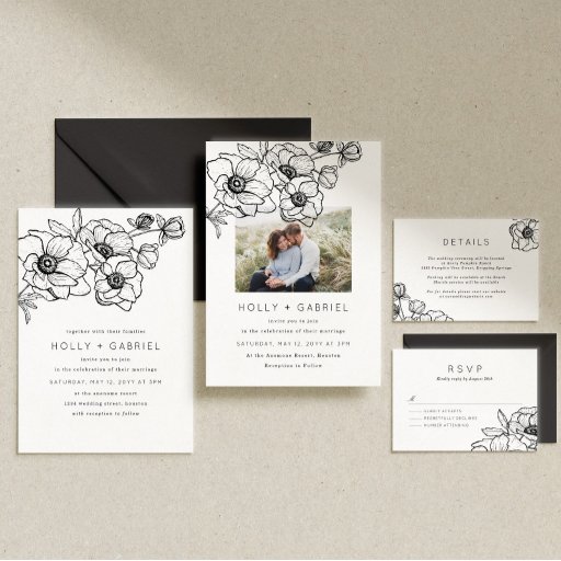 Plain white envelopes are included with paper invitations and will come to fit the invitation size you select. If you don’t need the envelopes, you may choose to not receive them by selecting the dropdown below "Envelopes" and choosing "None." If you’d like to have a design on your envelopes, you can browse all of these available envelopes to find the design that complements your Anemone Bouquet Wedding Invitation.