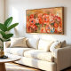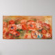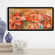 The artwork depicts red, orange and white anemones tumbling across this horizontal composition over a neutral background. Vivid and bright colors dominated by red and orange with some shades of blue and green.