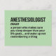 This hilarious anesthesiologist job definition postcard makes a thoughtful and light-hearted gift for anyone in the medical field. Perfect for anesthesiology residents, CRNAs, doctors, and med school graduates. Great way to add humor to workplace notice boards or medical student dorm rooms.
