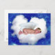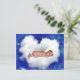 Cute angel baby with wings and halo sleeping soundly on a floating fluffy white cloud in the blue heaven skies.